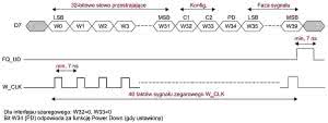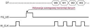 Aby to jednak było możliwe, producent układu wymaga zastosowania odpowiedniego rozwiązania sprzętowego: wyprowadzenia nr 3 i 4 układu AD9850 (D1 i D0) należy dołączyć do napięcia zasilającego, zaś wyprowadzenie nr 2 (D2) do masy, jak również zastosować należy specjalną sekwencję sygnałów sterujących (W_CLK i FQ_UD), dzięki czemu możliwa stanie się komunikacja we wspomniany wcześniej sposób. Sekwencję sygnałów sterujących niezbędną do aktywacji szeregowego interfejsu danych układu AD9850 przedstawiono na rysunku 4.
