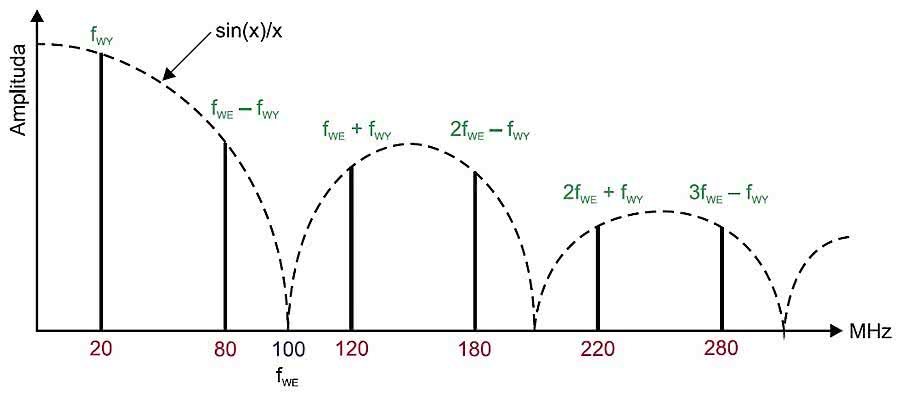 Częstotliwość tych niepożądanych sygnałów jest równa sumie i różnicy wielokrotności częstotliwości zegara taktującego akumulator fazy i częstotliwości sygnału wyjściowego, zaś ich amplituda wynika z przebiegu funkcji sin(x)/x. Poglądowy rysunek zależności amplitudy sygnału wyjściowego poszczególnych aliasów w funkcji ich częstotliwości dla częstotliwości wyjściowej fWY=20 MHz i częstotliwości generatora taktującego fWE=100 MHz pokazano na rysunku 6.