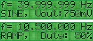 I tak, dla przykładu, pierwsze wciśnięcie przycisku kHz powoduje przejście do regulacji (za pomocą enkodera) setek tysięcy kiloherców, następne, do regulacji dziesiątek tysięcy kiloherców a kolejne do regulacji tysięcy kiloherców itd. Ten sam mechanizm, co oczywiste, tyczy się przycisków MHz i Hz. Z kolei, przycisk VOUT/DUTY służy do regulowania napięcia wyjściowego analogowego sygnału sinusoidalnego, dostępnego na wyjściu urządzenia (w zakresie 0,15V...0,8 V z krokiem 0,05 V) lub do regulowania wypełnienia sygnału prostokątnego (w zakresie 10...90% z krokiem 5%), w zależności od trybu pracy urządzenia.