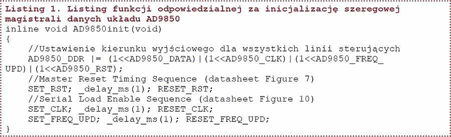 Listing 1. Listing funkcji odpowiedzialnej za inicjalizację szeregowej magistrali danych układu AD9850
