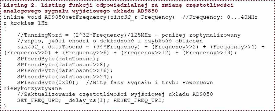 Listing 2. Listing funkcji odpowiedzialnej za zmianę częstotliwości analogowego sygnału wyjściowego układu AD9850