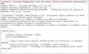 Wspomniany próg zadziałania ustawiono na wartość 4,3 V, co oznacza, iż czas opadania napięcia zasilającego od 4,3 V do 2,7 V jest czasem, w którym mikrokontroler musi przeprowadzić zapis wszystkich danych konfiguracyjnych - w naszym przypadku 11 bajtów danych. Jak pokazały testy praktyczne, zastosowanie wspomnianego wcześniej rozwiązania sprzętowego (dioda D1 i kondensator C4) i mechanizmów programowych zapewnia 100% skuteczność zapisu danych z bardzo dużym marginesem czasowym. Listing zawierający rozkazy konfiguracji przetwornika A/C oraz procedury obsługi jego przerwania pokazano na listingu 3.