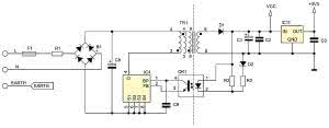 Na rysunku 3 przedstawiono schemat aplikacyjny zastosowanego zasilacza. Urządzenie potrzebuje dwóch napięć stałych: 3,3 V - zasilanie modułów Tibbo oraz 5 V zasilanie przekaźników sterujących silnikiem rolet. Schemat niewiele odbiega od noty aplikacyjnej układu LNK362. Baczną uwagę należy zwrócić na obwód pierwotny zasilacza.
