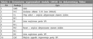 EM500 jest najmniejszym (pod względem gabarytów) modułem firmy Tibbo (rysunek 5). Wyprowadzenia zgrupowane zostały w pojedynczym 22-pionowym konektorze szpilkowym (tabela 1). Moduł ma 512 kB wewnętrznej pamięci Flash, która jest dzielona pomiędzy aplikację użytkownika (320 kB) a systemem operacyjnym TiOS (192 kB).