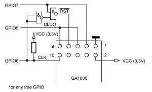 Podłączenie modułu GA1000 do EM500 w sposób rekomendowany przez producenta pozwala na ograniczenie niezbędnych linii I/O do trzech. Jest to możliwe dzięki "dwukierunkowym" buforom linii IO w EM500 (pozwalającym na połączenie linii DI i DO oraz na zastosowaniu logicznego układu (składającego się z dwóch bramek NAND, którego celem jest generowanie sygnału resetu przy inicjalizacji modułu GA1000 (sygnał resetu powstaje z kombinacji sygnałów CS i zegarowego - CLK).