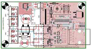 Na rysunku 12 przedstawiono schemat montażowy płytki drukowanej sterownika. Należy zwrócić uwagę na linię separującą sekcję wysokonapięciową od niskonapięciowej. Separacja jest zrealizowana poprzez transformator TR1, optoizolator OK1 oraz przekaźniki elektromagnetyczne K1 i K2. Z uwagi na ilość ciepła wydzielanego przez układ IC4, został on wyposażony w duży obszar miedzi po obu stronach PCB połączonych przelotkami.