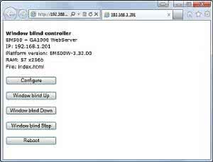 Oprogramowanie modułu umożliwia pełną konfigurację interfejsu ethernetowego oraz realizuje podstawowe funkcje sterownika. Kontrola sterownika możliwa jest wyłącznie poprzez interfejs WWW. Na rysunku 13 Przedstawiono widok głównej strony sterownika. Przyciski Window blind Up, Window blind Down, Window blind Stop umożliwiają odpowiednio ruch rolety w górę, w dół oraz zatrzymanie ruchu.