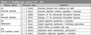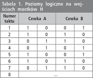 Analizując kierunki przepływu prądu w cewkach silnika można zauważyć, jakie są konieczne poziomy logiczne na wejściach mostków H, wymagane do prawidłowego zasilenia cewek bipolarnego silnika krokowego, a jednocześnie niepowodujące zbędnej komplikacji układu sterowania. Poziomy te zawiera tabela 1.
