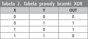 Tabela 2 jest tablicą prawdy bramki logicznej typu XOR. Jeżeli na jedno z wejść zostanie podane logiczne "0", wówczas wyjście jest kopią stanu logicznego drugiego wejścia. W drugim przypadku, po podaniu na stałe logicznej "1", wyjście jest negacją drugiego wejścia. Bramka ta zostanie wykorzystana jako "sterowany negator", służący zmianie kierunku obrotów. Dokładniej rzecz ujmując, za jej pomocą zostaje zmieniony znak fazy określającej przesunięcie między dwoma sekwencjami sygnałów sterujących: z +90° na -90°.