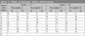 Dodatkowo, wiedząc, iż rolą przerzutnika typu D jest powtarzanie na wyjściu Q poziomu logicznego, który w momencie nadejścia zbocza sygnału zegarowego znajdował się na wejściu D, można prześledzić obieg stanów logicznych w tym układzie. Tabela 3 zawiera taki przykład - polecam samodzielną analizę na podstawie schematu ideowego z rysunku 1.