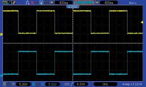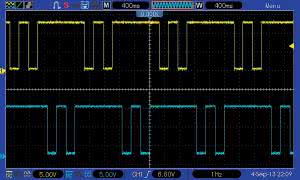 Wpływ takiego rodzaju sterowania jest widoczny na rysunku 2, który pokazuje przebiegi napięć sterujących jednym mostkiem H po zastosowaniu tej prostej metody redukcji poboru prądu: przez większość czasu cewka jest wyłączona (takie same poziomy logiczne na wyjściach) i załączana jest w momencie wykrycia kolejnego okresu sygnału zegarowego. Rysunek 3 obrazuje, dla porównania, to samo wyjście, lecz bez "przerywacza", z cewkami stale uruchomionymi. Oscylogramy zostały rozsunięte w pionie, aby nie nakładały się na siebie.