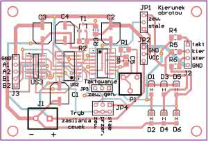Układ został zmontowany na dwustronnej płytce drukowanej o wymiarach 7,5 cm×5 cm. Jej schemat montażowy pokazano na rysunku 4. Wszystkie elementy, poza potencjometrem i złączami, lutowane są powierzchniowo na górnej warstwie. Warstwa dolna zawiera jedynie ścieżki, nie znajdują się na niej żadne opisy ani podzespoły.