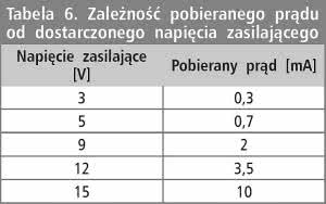 Sterownik należy zasilić napięciem stałym, dobrze filtrowanym, najlepiej stabilizowanym, z przedziału akceptowalnego przez układy CMOS rodziny 4xxx. Zależność poboru prądu przez układ modelowy od napięcia zasilania przedstawia tabela 6. Wartości te zostały zmierzone przy taktowaniu wewnętrznym generatorem z największą częstotliwością oraz przy braku jakichkolwiek doprowadzeń z zewnątrz.