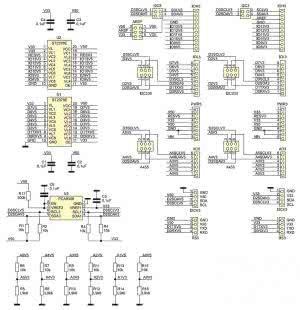 Schemat ideowy układu konwertera przedstawiony jest na rysunku 1. Złącza i zwory, w których oznaczenia zakończone są cyfrą "5" są dołączone do interfejsu o poziomach napięć logicznych 5 V (płytka rozszerzeń), elementy z oznaczeniami zakończonymi cyfrą "3" są dołączone do płytki bazowej, o poziomach napięć logicznych 3,3 V.