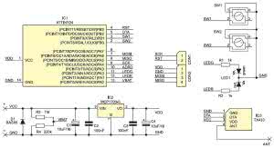 Schemat ideowy nadajnika pokazano na rysunku 1. Składa się on z mikrokontrolera ATtiny24, modułu radiowego TX433 i kilku elementów biernych. Najważniejszym elementem składowym nadajnika jest jednak program zawarty w pamięci mikrokontrolera.