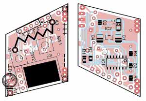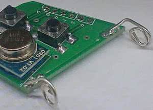 Diodę LED należy wlutować ok. 1 cm nad płytką i zagiąć, by przesunęła się poza krawędź płytki (fotografia 4), a otwór na diodę w obudowie należy nieco powiększyć. Do punktów "+" i "-" należy przylutować kawałki srebrzanki i zagiąć je tak, by pełniły rolę styków baterii (fotografia 5). Na krawędzi znajduje się złącze umożliwiające dołączenie programatora (punkty R, S, MI, MO, G, V) i programowanie mikrokontrolera w układzie.