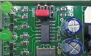 Dodatkowo, dioda LED1 miga informując o aktywnym stanie urządzenia. Złącze PROG pełni dwie funkcje. Po pierwsze, pozwala na dołączenie programatora i zaprogramowanie mikrokontrolera w układzie (np. w celu zmiany adresu modułu). Po drugie, pozwala na ustawienie tryb pracy wyjść - zworka założona na szpilki 1-3 (fotografia 8) powoduje pracę monostabilną a więc wyjścia będą załączone tylko na czas wciskania przycisku pilota, brak zworki oznacza pracę klasyczną - bistabilną. Na złączach OUT1 i OUT2 wyprowadzone są styki zwierne przekaźników.
