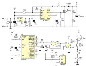 Schemat ideowy termometra pokazano na rysunku 1. Sercem układu jest mikrokontroler ATtiny2313 pracujący z użyciem wewnętrznego oscylatora RC o częstotliwości 1 MHz. Jako czujnik temperatury zastosowano popularny układ scalony DS18B20 umożliwiający pomiar w zakresie od -55 do 125°C z rozdzielczością maksymalną 12 bitów. Układ U1, wraz z zestawem elementów zewnętrznych, stabilizuje napięcie 5 V służące do zasilania części cyfrowej termometru.