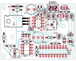 Na rysunku 3 pokazano schemat montażowy układu. Kolejność wlutowywania elementów nie jest konieczna, ale warto zacząć od najmniejszych aż po największe. Podczas montażu należy pamiętać, aby wlutować wszystkie zworki. Pod mikrokontroler i pod pozostałe układy scalone najlepiej zastosować odpowiednie podstawki.