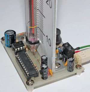 Do wyświetlania temperatury zastosowano - pokazany na fotografii 2 - radziecki barograf Nixie IN13 o napięciu zapłonu 140 V. Do sterowania lampą służy regulowane źródło prądowe składające się z wzmacniacza operacyjnego U4A, tranzystora wysokonapięciowego T2 oraz rezystora R9 i potencjometru kalibracyjnego. Wzmacniacz operacyjny steruje prądem bazy tranzystora T2 tak, aby spadek napięcia na rezystorze i potencjometrze był taki sam, jak napięcie na wejściu nieodwracającym.