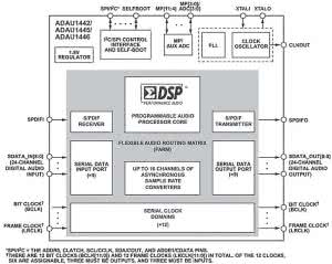 W związku z pewnym postępem technicznym od czasów EP12/99, generacja przebiegów testowych została powierzona procesorowi DSP. Zastosowano układ z rodziny SigmaDSP ze względów opisanych we wcześniejszych artykułach (min. łatwości tworzenia aplikacji, co jest niewątpliwą zaletą dla osób nieumiejących programować). Spośród rodzin układów ADAU1701, ADAU144x, ADAU145x wybrałem ADAU1446. Schemat blokowy procesora DSP z grupy ADAU144x zaprezentowano na rysunku 1.