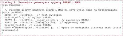 Sygnały z przełączników są odczytywane przez porty cyfrowe i zależnie od ich stanu, w ramce DMX w kanałach od 7 do 12, zapisywana jest wartość 0 lub 255. Tak skompletowana ramka, po uzupełnianiu sygnałami BREAK, MAB i SC, jest wysyłana na magistralę (listing 2).