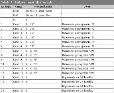 Wysyłane są 24 kanały DMX, ponieważ takie wymagania stawia norma. W kanałach od 14 do 24 na stałe jest zapisana wartość 0. Budowę ramki wysyłanej przez konsolę umieszczono w tabeli 1.