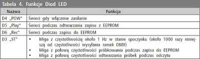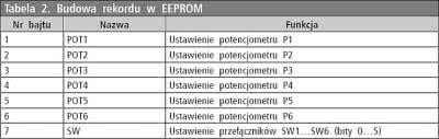 Naciśnięcie przycisku REC spowoduje zaświecenie diody REC oraz rozpocznie proces rejestracji nastaw potencjometrów i przełączników do pamięci EEPROM. Zapis kończy się po ponownym naciśnięciu przycisku REC lub zapełnieniu pamięci. Budowę rekordu zapisywanego w pamięci EEPROM opisuje tabela 2.