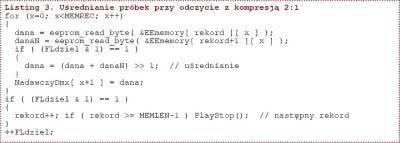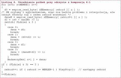 Aby wydłużyć czas zapisu zastosowano małą "sztuczkę". Dane zapisywane są do EEPROM co 80, 160, 320 lub 640 ms, zależnie od ustawienie przełączników KOMPRESJA i TEMPO. Dane o położeniu potencjometrów są wysyłane zawsze co 80 ms, ale pobierane są z EEPROM co 80 lub 160 ms, a dane pomiędzy próbkami są uśredniane (listing 3).