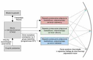 Schemat blokowy sterownika diod LED pokazano na rysunku 1. Działanie sferycznej matrycy polega na wyświetlaniu obrazu zapisanego w pamięci mikrokontrolera. To wyświetlanie musi być zsynchronizowane z czasem trwania pojedynczego obrotu. Wyświetlane dane są wysyłane pakietami. Pakiet zawiera 48 bitów, czyli 6 bajtów danych, które trafią do jednej z trzech grup rejestrów przesuwnych.