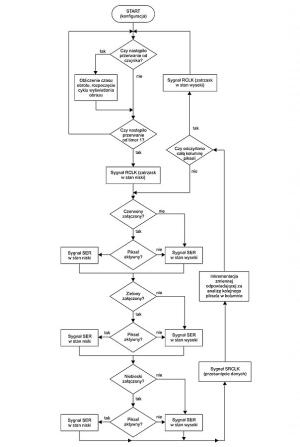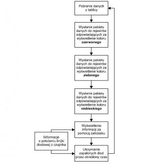 Na rysunku 2 pokazano schemat blokowy procedury obsługi kulistego wyświetlacza. Program realizujący postawiony cel musi wykonywać się jak najszybciej. Wymuszają to ramy czasowe oraz duża liczba wysyłanych danych, a także pozostałe funkcje, które muszą być zrealizowane w tym samym czasie. Dla zwiększenia szybkości działania bity danych są przesyłane kolejno na wszystkie trzy grupy rejestrów, po każdym impulsie odpowiadającym za przesunięcie bitów.