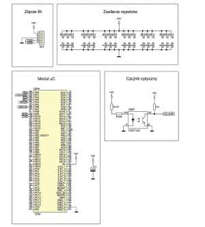 Działanie układu polega na ciągłym monitorowaniu linii PA1, do której dołączono czujnik optyczny. Licznik pracuje bez przerwy, a po wykryciu zbocza narastającego na linii PA1 jest wywoływana funkcja obsługi przerwania. Jej zadaniem jest wyzerowanie flagi przerwania, odczytanie przechwyconej wartości licznika kanału 2, oraz wyzerowanie licznika Timer 2.