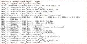 W dalszej części - listing 2 - następuje konfigurowanie wejść i wyjść. Linie portu A: PA0…PA4, PA6 pracują jako wyjścia wysyłając dane do rejestrów przesuwnych. Dodatkowo, PA9 obsługuje wysyłanie danych od modułu Bluetooth. Wejściami są: sygnał z czujnika doprowadzony do linii PA1 oraz kanał odbioru danych USART do linii PA10. Właściwa konfiguracja następuje po włączeniu sygnału zegarowego dla portu I/O za pomocą wywołania funkcji RCC_APB2PeriphClockCmd(). Następnym etapem jest ustalenie, jaką rolę mają pełnić konfigurowane wyprowadzenia oraz szybkość ich pracy.