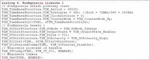 W drugim etapie zostaje skonfigurowany kanał licznika. Z czterech dostępnych użyty będzie kanał pierwszy, pracujący w trybie TIM_OCMode_Timing. Opcja oznacza, że urządzenie peryferyjne TIM1 będzie generowało przerwanie w momencie, gdy timer doliczy do wartości równej zawartości pola TIM_Pulse struktury inicjującej. Poziomem aktywnym będzie poziom wysoki, wybrany w polu TIM_OCPolarity. Ostatnim ustawianym polem jest TIM_OutputState, któremu nadano wartość TIM_OutputState_Enable. Sygnał z timera będzie wykorzystywany do sterowanie innym elementem systemu, kontrolerem przerwań.