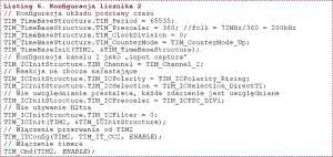 Zadaniem drugiego licznika Timer 2 będzie mierzenie okresu sygnału pochodzącego od czujnika (listing 5). W tym trybie licznik zaczyna liczyć, gdy wystąpi zbocze narastające na wejściu wyzwalającym. Dzięki temu można mierzyć częstotliwość sygnału wejściowego oraz odstępy czasu pomiędzy kolejnymi obrotami linijki diodowej. Konfiguracja timera w pierwszym etapie polega na ustawienia podstawy czasu.