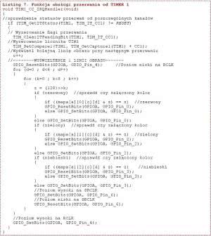 Kolejną częścią kodu programu jest funkcja wywoływana za pomocą przerwania licznika 1. Wywołanie następuje cyklicznie co 1/96 czasu trwania obrotu wirującej linijki diodowej, czyli czas obliczony i przechowywany w zmiennej CC1. Zadaniem podprogramu jest sprawdzenie co jest źródłem przerwania i dla którego kanału, wyzerowanie bitu przerwania, ustawienie rejestru przepełnienia, a także realizacja wyświetlenia jednej linii obrazu. Na listingu 7 zostało przedstawione ciało podprogramu.