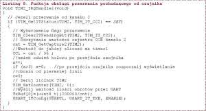 Po zakończeniu procesu konfiguracji układów peryferyjnych program przechodzi do realizacji dalszej części funkcji głównej, oraz funkcji wywoływanych przerwaniami (listing 7). Podprogram, którego zadaniem jest obsługa zdarzeń wywołanych sygnałem z czujnika przedstawiony jest na listingu 8.