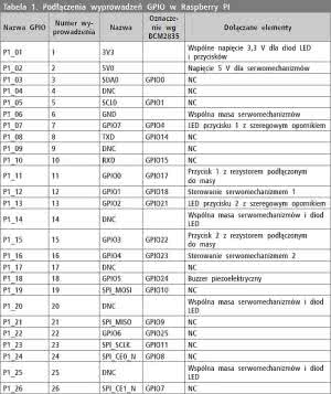 W omawianym projekcie autor skorzystał z wyprowadzeń o numerach 18 i 23, korzystając z nomenklatury wyprowadzeń układu BCM2835, do której następnie odnosi się w programie. Podłączamy opcjonalne diody poprzez rezystory, buzzer (do masy i pinu #24) i przełączniki. Lista połączeń znalazła się w tabeli 1. Jeśli dobrze dobierzemy dozownik, całość elektroniki zmieści się w podstawce obudowy.