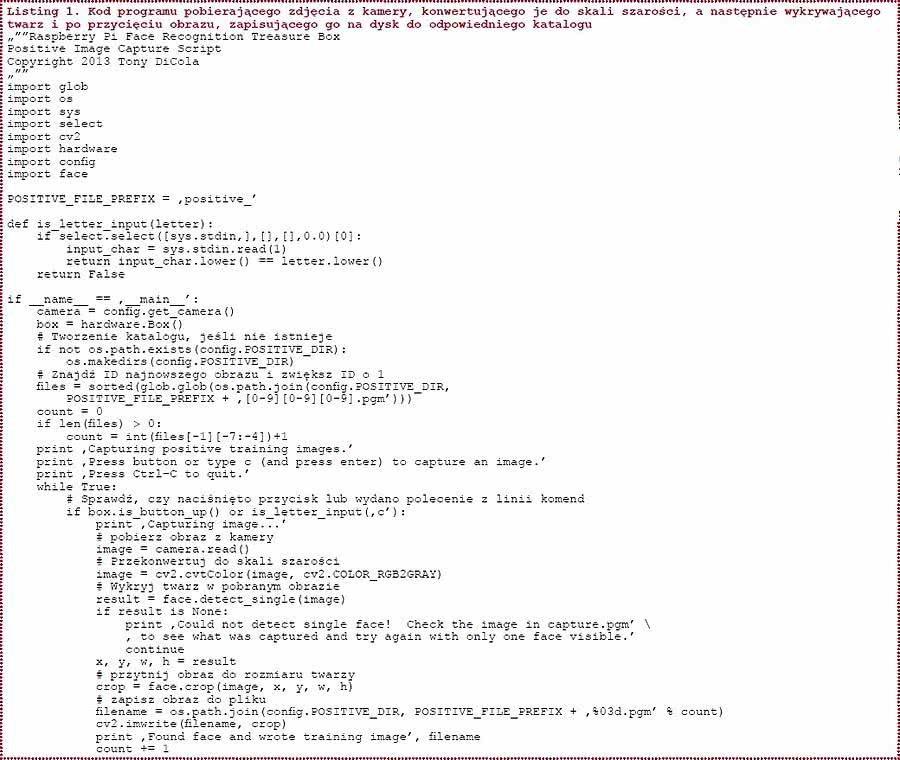 Baza ta dostępna jest pod adresem: http://goo.gl/s4vfUq i może się przydać do innych projektów. Bazę fotografii pozytywnych można stworzyć ładując wcześniej przygotowane zdjęcia lub wykorzystać do tego przygotowane pudełko z kamerą i skrypt capture-positives.py (listing 1). Warto w tym kodzie zwrócić uwagę na użycie funkcji: