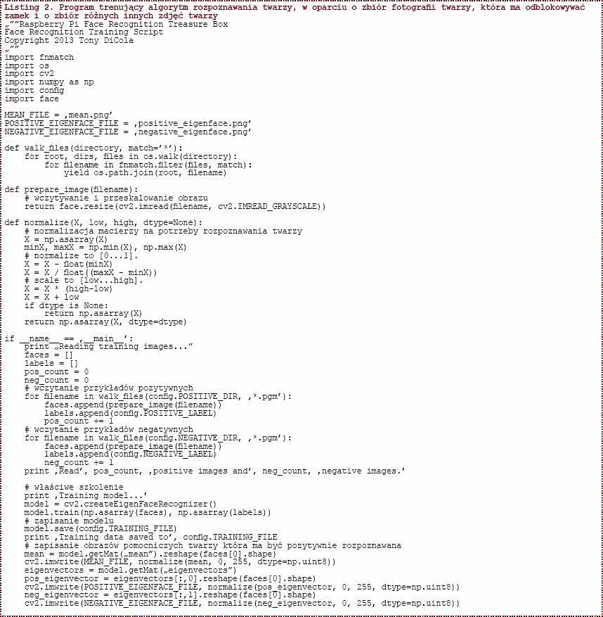 Listing 2. Program trenujący algorytm rozpoznawania twarzy, w oparciu o zbiór fotografii twarzy, która ma odblokowywać zamek i o zbiór różnych innych zdjęć twarzy