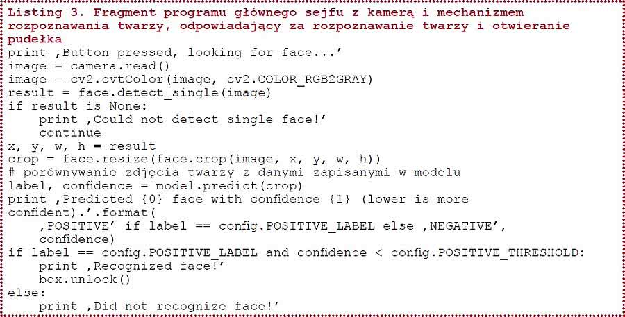 Listing 3. Fragment programu głównego sejfu z kamerą i mechanizmem rozpoznawania twarzy, odpowiadający za rozpoznawanie twarzy i otwieranie pudełka