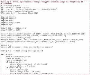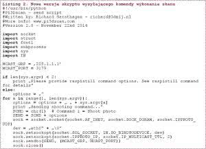 Skrypt sterujący komputerami z kamerami został przedstawiony na listingu 1 i listingu 2. W tym przypadku jest to wersja pozbawiona funkcji restartowania systemu. Korzysta m.in. z biblioteki socket do prowadzenia komunikacji ethernetowej, subprocess do wywoływania zewnętrznych poleceń i sys do pobierania argumentów poleceń.