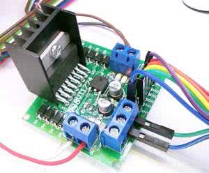 Stopień mocy dla silnika stanowi moduł AVT1724 zbudowany w oparciu o driver L298 (fotografia 3). Oprócz czterech sygnałów sterujących użyto sygnałów aktywujących (załączających) stopień mocy: ENA i ENB. Dzięki temu, gdy sterownik nie pracuje, możliwe jest swobodne obracanie dyskiem statywu.