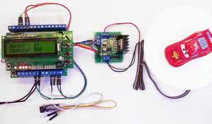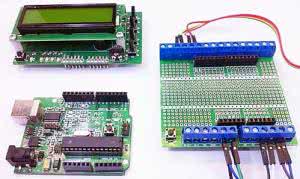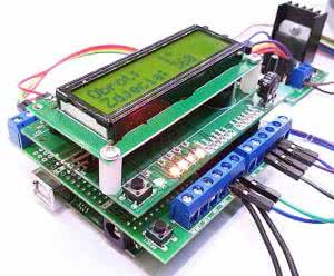 Jako interfejs pracuje moduł AVT1615, który ma wyświetlacz LCD i cztery przyciski. Dla ułatwienia wykonania połączeń zastosowano moduł AVT1633 - płytka ze złączami typu ARK dołączonymi do wyprowadzeń Arduino. Moduły połączono w formie "kanapki", co pokazano na fotografiach 4 i 5.