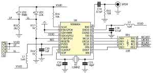 Schemat ideowy odbiornika S/PDIF zamieszczono na rysunku 2. Cyfrowy sygnał wejściowy z gniazda S/PDIF jest doprowadzony do odbiornika U8 (WM8804) pracującego w trybie konfiguracji sprzętowej master I2S z rozdzielczością 24 bitów.