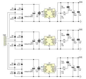 Współpracujące z ADP7102 dzielniki ustalają napięcia wyjściowe stabilizatorów. Możliwe jest zastosowanie układów o ustalonym napięciu wyjściowym +5 V i +3,3 V(przy zwartym R4 i niezamontowanych rezystorach R5 i R6, kondensatorze C8 i odpowiadających im komponentów w pozostałych zasilaczach).