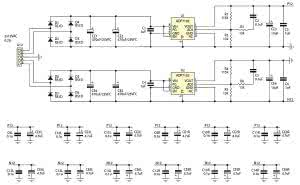 Układ dostarcza trzech napięć, U3 - V50A zasilającego część analogową AD1955, U4 - V50D zasilającego część cyfrową AD1955 i konwertery poziomów U2,5 oraz U7 dostarczający napięcia V33D dla zasilania odbiornika SPDIF i pozostałych układów cyfrowych. Każdy ADP7102 zasilany jest z osobnego uzwojenia transformatora.