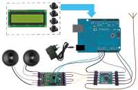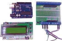 Sterowanie modułem zrealizowano na bazie płytki Arduino Uno z dołączoną płytką interfejsu użytkownika AVT1615. Dla wygody zestaw został uzupełniony o płytkę ze złączami - AVT1633. Elementy zestawu pokazano na fotografii 6. Sposób połączenia wszystkich komponentów zaprezentowano na rysunku 7 i dla ułatwienia, rzeczywisty wygląd na fotografii 8.