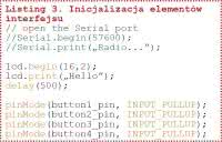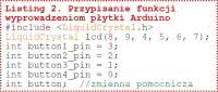 Do projektu należy dodać obsługę wyświetlacza oraz przycisków dostępnych w płytce AVT1615. Przed wywołaniem funkcji setup() należy dodać fragment z listingu 2, natomiast wewnątrz tej funkcji fragment z listingu 3. W ten sposób przypisujemy wyprowadzeniom płytki Arduino odpowiednie funkcje, inicjujemy wyświetlacz oraz wyłączmy port szeregowy, który zakłócałby działanie przycisków.