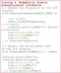 Kolejne zmiany mają za zadanie przeniesienie na wyświetlacz informacji wysyłanych do portu szeregowego. Należy zmodyfikować funkcje DisplayFrequency() oraz DisplayServiceName() jak na listingu 4. Ostatnia zmiana to umieszczenie na końcu programu funkcji sprawdzającej stan przycisków ButtonCheck() oraz wywoływanie tej funkcji wewnątrz pętli głównej loop() jak na listingu 5.